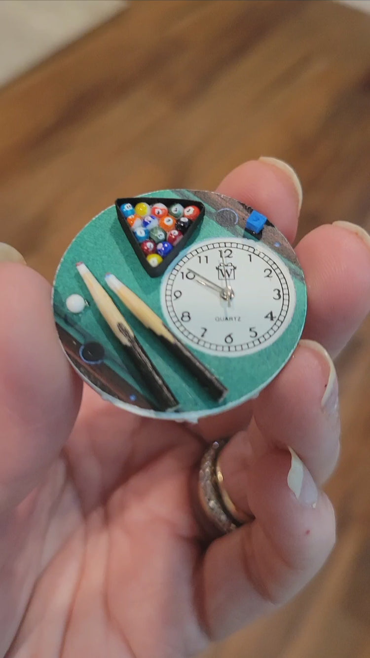 Nice rack! Handmade in the USA by our talented team of artists using handcrafted miniatures, our newly redesigned Billiards Watch features 15 tiny, individually hand-painted and racked balls, a pair of pool cues, tiny chalk cube and cue ball, all atop a pool-table-top background. Whether you're a professional pool shark or rank beginner, this wearable work of art will up your game as you stylishly sink the eight ball into the corner pocket.