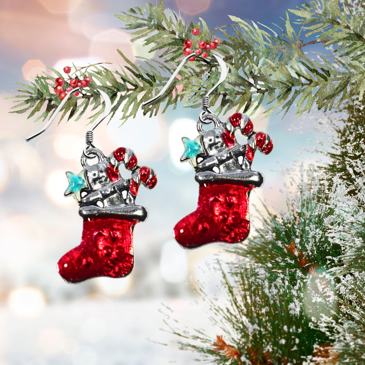 Our sweet Stocking Charm Earrings are filled to the top with toys and treats! Christmas Stockings measure 19 mm x 16 mm in size and are hand-poured in the USA from lead-free pewter and plated in an antique gold or antique silver finish before being hand-painted by our team. Earring hooks are sterling silver or gold-plated French wire and include rubber backs.