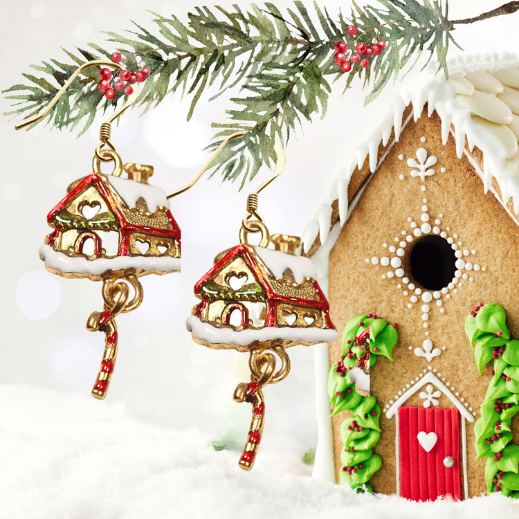 Evoking scents of ginger, cinnamon and cloves, our Christmas Gingerbread House Charm Earrings make great gifts for bakers, gingerbread home builders, and Christmas cookie lovers alike! Our American-manufactured, hand-painted charms measure approximately 34mm x 19 mm and feature heart-shaped windows, frosted roofs and self-linked candy canes for extra movement. Pump up the volume on your holiday spirit with these super-cute cookie cottages! Earring hooks are sterling silver or gold plated French wire and include rubber backs.