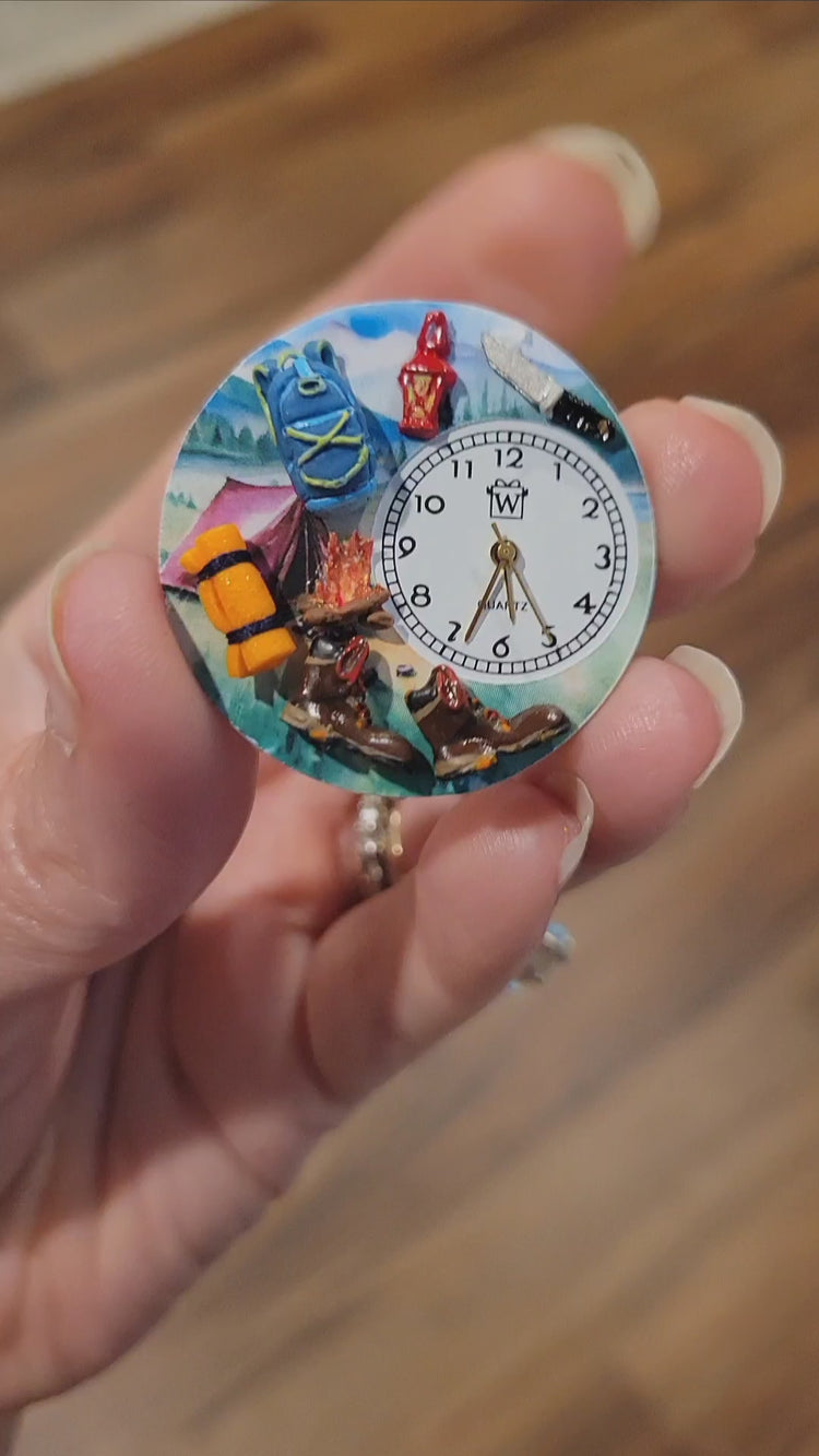 It's been said that the best way to experience nature is on foot, and our NEW Hiking | Camping Watch is perfect for anyone who loves the great outdoors! Handmade in the USA by our team of artists, our Hiking | Camping Watch features a tiny campfire, pair of hiking boots, sleeping bag, backpack, lantern and utility knife, all atop a breathtaking mountainous background - the ultimate campsite! You'll never be far off the path with this wearable work of art!