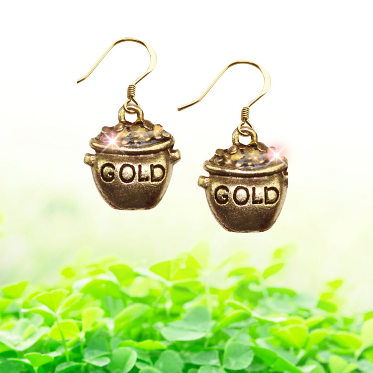 Aye, the fabled pot of gold at the end of the rainbow. If only we could get there in real life! Until then, don these shimmering pots of gold painted by hand with sparkling gold flecks. Hand cast in America from lead-free pewter, our Pot of Gold Charm Earrings are also plated, hand-painted and assembled in the USA. Earring hooks are gold plated French wire and include rubber backs.