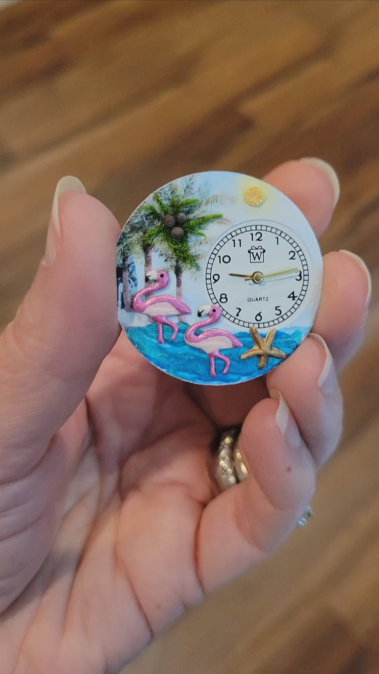 The perfect gift for flamingo lovers! Handmade in the USA by our team of artists using hand-painted miniatures, our Flamingo Watch features a pair of leggy pink flamingos wading in shallow waters near a sunny beach, with coconut dotted palms and a golden starfish. Whimsical Gifts watches are wearable works of art and make a thoughtful gift for any occasion!