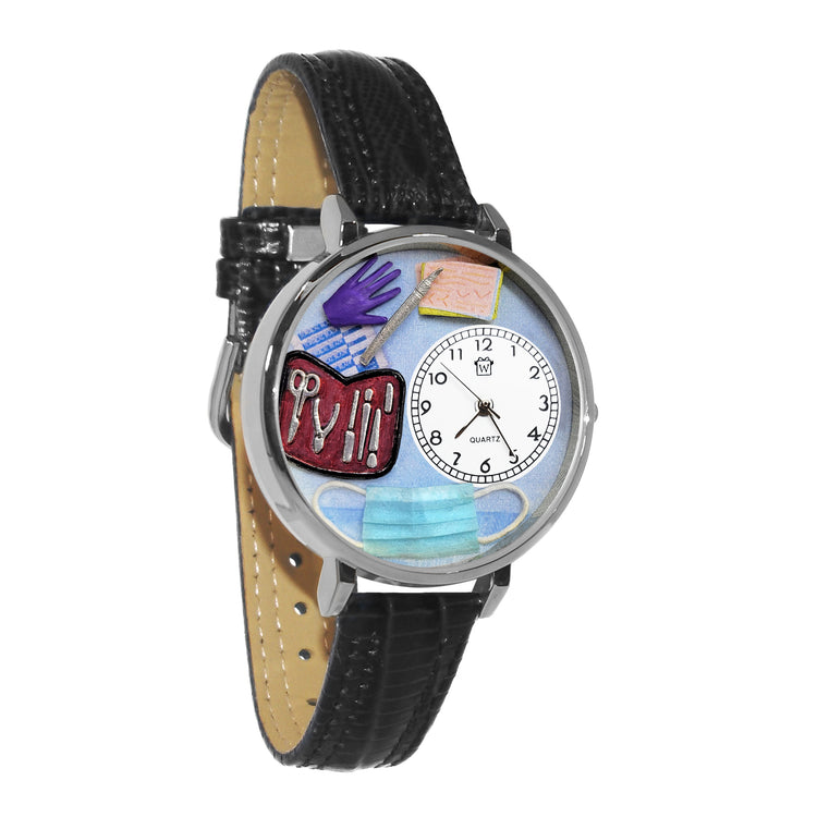 A great gift for surgeons, ER doctors, advance practice nurses, wound care specialists, and medical professionals in training, our NEW Medical Suture Watch has everything you need to work on your suture and wound dressing techniques! Made in the USA by our team of artists and graphic designers using handcrafted miniatures, our Medical Suture Watch features a tiny scalpel and suture pad with wounds, instrument kit with scissors, forceps and probes, a latex-free nitrile glove and a tiny surgical mask, all atop a blue surgical drape background. Whimsical Gifts watches are wearable works of art and a super sharp way to express your career in cutting and suturing!