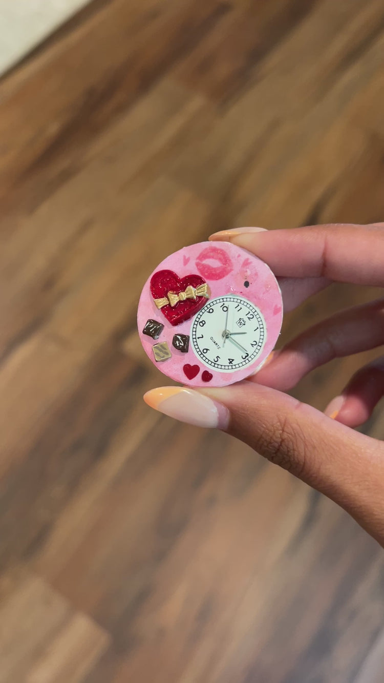 Calorie free chocolates on Valentine's Day? Yes, please! Enjoy our heart-shaped Chocolate Box Watch, featuring a gold ribbon wrapped box of chocolates and an assortment of tiny candies (and it looks like someone was testing the fillings!). Made in the USA by our team of artists and graphic designers, enjoy these guilt-free chocolates on Valentine's Day or anytime you want to express your individuality and love of chocolate!