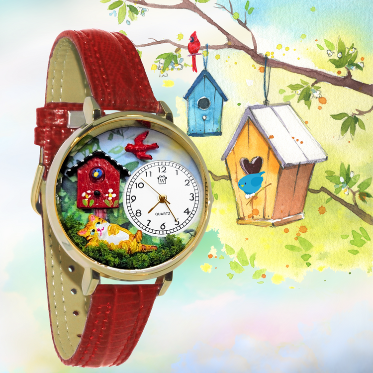 Whimsical Gifts | Cat Bird Daydream 3D Watch Large Style | Handmade in USA | Animal Lover | Cat Lover | Novelty Unique Fun Miniatures Gift | Silver Finish Red Leather Watch Band Whimsical Gifts | Cat Bird Daydream 3D Watch Large Style | Handmade in USA | Animal Lover | Cat Lover | Novelty Unique Fun Miniatures Gift | Gold Finish Red Leather Watch Band